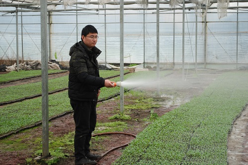 单鲁文正在育秧棚内给秧苗浇水
