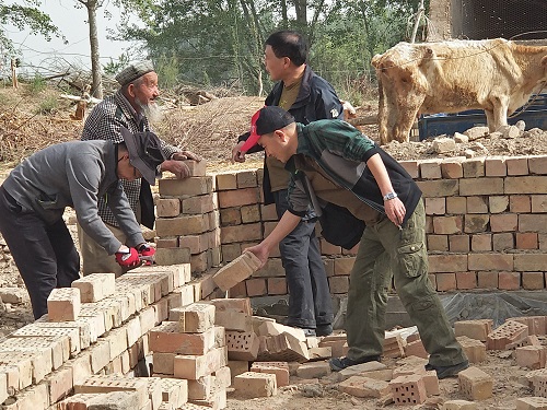 5月初夏,艳阳高照,侯文斌再次来看望艾买尔大爷,听说大爷已买好砖块、沙子和水泥,准备自己动手砌墙盖羊圈。侯文斌一听大爷要自己动手,遂找来7名同事帮忙。从太阳升起干到日落,舍不得休息,饿了就吃大爷精心准备的水果和点心,渴了就喝甜甜的冰糖茶。