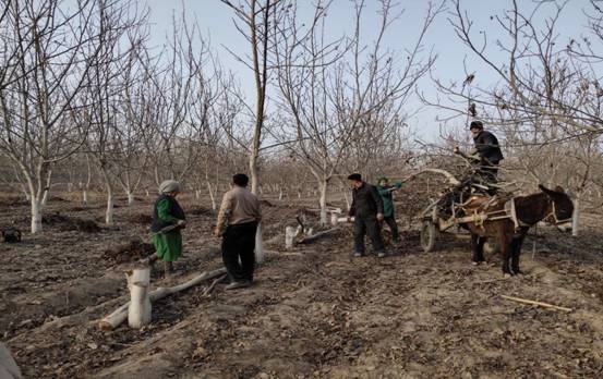 “临近春耕,城里的亲戚来帮我家春耕工作做准备,帮助我清理核桃林和清理地膜,村里的工作队员和村干部、党员也都来帮我,仅用了3天时间就把春耕前的整理工作做好了,也解决了我家中缺少劳动力的困难,我很高兴,对我的亲戚、工作队、村干部、党员也表示感谢!”村民阿米娜•艾拜激动的说。正值春耕备耕期间,因家中缺乏劳动力,家中3亩核桃和30亩耕地清理整顿工作就显得极为紧迫。阿米娜•艾拜的结亲户阿里米拉在走访过程中了解到这一困难,立即表示要帮助阿米娜•艾拜做好春耕准备工作。在阿里米拉的感染下,工作队、村干部及村里的党员自发组织起来,一起帮助阿米娜•艾拜为春耕做准备。经过3天的努力春耕前的所有准备都完工了。