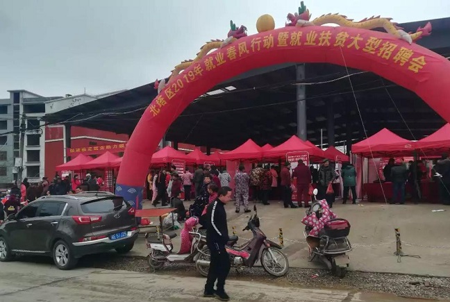 清风网邵阳讯(通讯员:白拓 陈阳砚 邓洪都) “不出家门口也能找到一份稳定的工作,多爽啊!白天上班,晚上回家还能照看孩子,能把所学的技能发挥出来,每个月能挣1080-2000元,还有提成呢!”3月2日,邵阳市北塔区陈家桥乡唐女士开心地说。日前,北塔区在陈家桥乡举办2019年就业春风行动暨就业扶贫大型招聘会。这是一场开在农民家门口的专属招聘会,填写简历、面试、录用在招聘现场一站搞定。