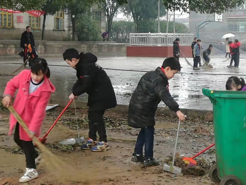 班会结束后,全校师生分别奔赴校内外两个战场。一部分负责校内卫生的整治,他们清理卫生死角,清除牛皮藓,干得热火朝天。一部分负责学校周边人居环境整治,他们深入到周围的村庄捡拾白色垃圾,宣传文明健康的生活方式,深受广大市民好评。六年级一女学生告诉笔者,老师经常教育他们要努力学习,改变家乡的贫困面貌,现在她用自己力所能及的行动为村庄献一份力,希望自己的家园更加美丽。
