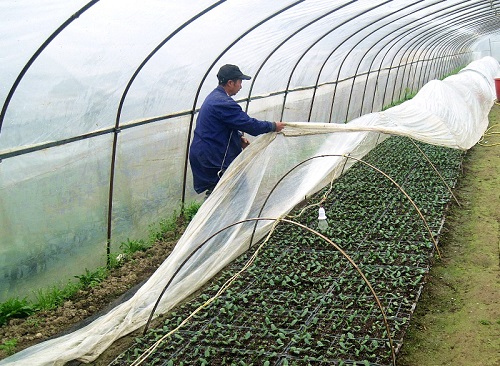 3月6日上午,新邵县陈家坊镇司门村一位谢姓菜农在大棚里观察丝瓜种苗的生长情况,期盼着今年种植的大棚蔬菜有个好收成。