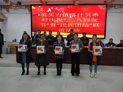 三八妇女节活动经过村委会和工作队的精心准备,我喀什贝希村在后盾单位阿克苏水文勘测局局长王进、喀什贝希村第一书记艾尔肯·吐拉克的主持下,于3月6日组织我村的全体群众开展了“英买力镇喀什贝希村庆祝三八妇女节暨民族团结联谊活动”,活动首先以王进局长致辞开场,以百家宴为预热,以表彰“三八红旗手”为穿插,以各种各样的节目如:歌曲、舞蹈、和“给妈妈洗一次脚”、“摸手辨别媳妇儿”等为内容,整场活动充满欢声笑语,下沉干部和自己的民族亲戚一起跳起了麦西来甫。