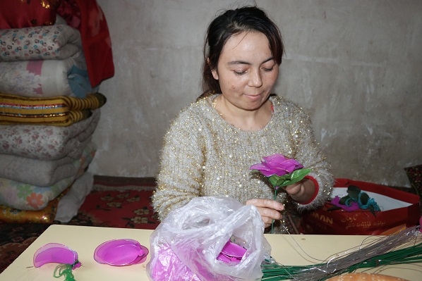 “白天除了做家务,就是做花,还可以为自己带平一份不小的收入。”古丽加马力掩饰不住内心的喜悦。自从她扎花的消息从村里传开后,她做的花真就有了销路。一个多月的时间,她仔细算了一下已经赚了一千多元。