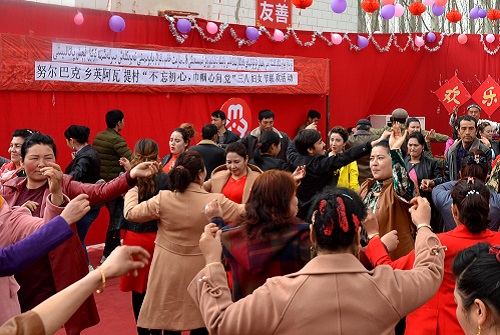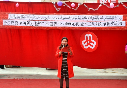 英阿瓦提村妇女自编自导的独唱、朗诵、舞蹈等精彩节目轮番登场,充分展示了新时代的巾帼风采,赢得了现场村民热烈的掌声;村两委对“最美儿媳”“最美家庭”“最美婆婆”等12位妇女代表进行了评选表彰,充分展示了妇女 “自尊、自爱、自立、自强”的精神风貌;最后大家兴高采烈地随着欢快的节奏一起载歌载舞,用深情的演唱歌颂今天的幸福生活,优美的舞蹈表达对党的感恩之情。