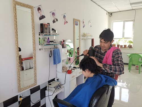阿克苏地区农业农村局驻村工作队在入户走访时了解到库尔班有一手理发的手艺,在英买力村扶贫市场建成后,工作队为库尔班协调到一间门面,并积极出谋划策,理发店渐渐走上了正轨。