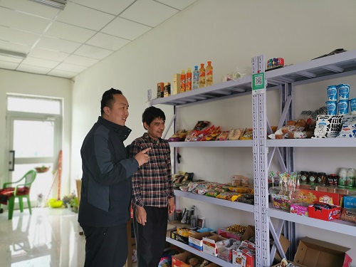 工作队通过调研发现,店内理发区域只是占用了部分空间,剩余的空间还可以摆上两排货架,这样就可以充分利用有限空间,收入也可以再翻一番。工作队通过联系,为库尔班赊购了两个货架,货架上摆满了零食、日用品。两个货架不但进一步增加了收入,还间接带动了理发店的人流,一举两得。