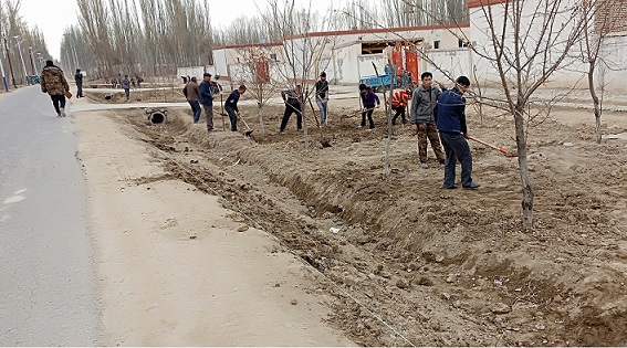 天山脚下的村庄,春意总是来得缓慢,这里的三月初暖意缓缓而来,春光无限好,成群的大雁在天空中翱翔,天山雪水融化,树木长出枝丫,在干部的带领下这里的村民走出家门,开始为美丽乡村建设,庭院改造献出一份力量,为节省经济减轻负担,干部群众集思广益,用石子改造乡村环境,规划、拉线、平地、摆石子,维修渠道,群众不亦乐乎。
