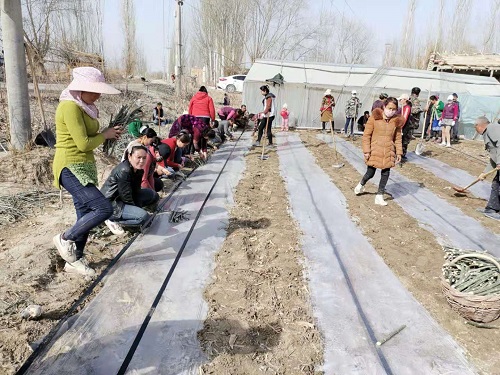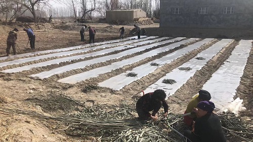 在田间地头,村第一书记、工作队队长给他们进行指导,动员鼓励队员和村“两委”积极的帮助贫困户铺地膜,减轻他们的劳动负担,增强干部的对人民群众的服务意识和对群众亲情,利用1个多小时的时间,一行行整整齐齐的地膜已全部铺完,并一同栽种树木,在现场赛麦提·伊斯马伊力给工作队队员和村“两委”说:“我们只要经常性的跟群众劳动在一起、在他们忙碌的时候去主动的帮助他们解决困难,只有这样才能够融入到群众,全面了解群众的所需所求”。贫困户艾麦提·托合提说:“赛书记,你们真的是太好了,帮助我们劳动,并且时刻为我们群众着想,我们真的是很感动!”。