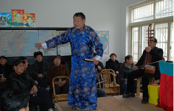 3月8日下午,宋百岳在余姚梨洲街道最良村老年活动中心表演宁波走书《大红袍》。