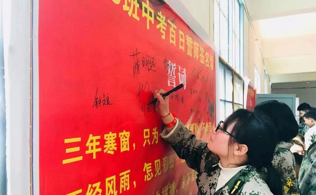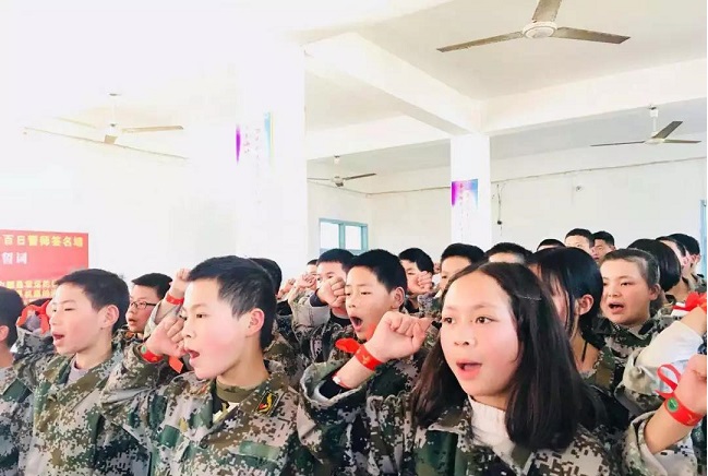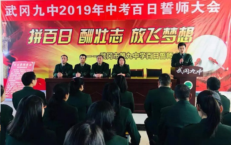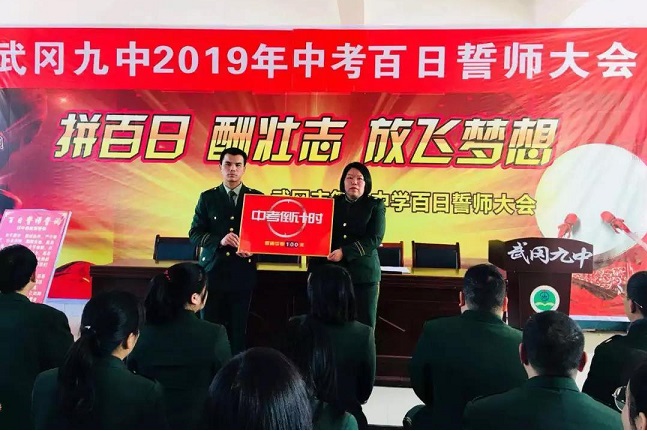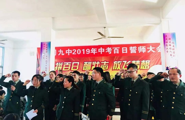“让我们加倍珍惜这100天,做好手中的每一道题,走好脚下的每一步路,调动起全部的智慧,凝聚起全部的热情,为100天后的中考奋力冲刺!让我们的青春,在这临近中考的100天中闪耀出最美丽的光彩!”铮铮誓言,铿锵有力,必将激励武冈九中所有学子向着胜利奋勇冲刺!