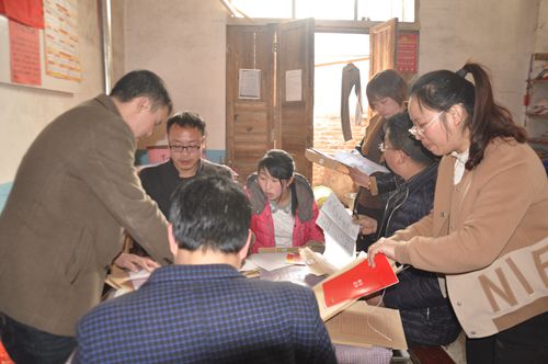 3月12日下午,湖南省隆回县金石桥镇高洲中学教师正在华溪村村部整理完善走访后的教育扶贫资料。这是该镇中心学校开展教育扶贫大走访及政策再宣传活动的一个侧影。