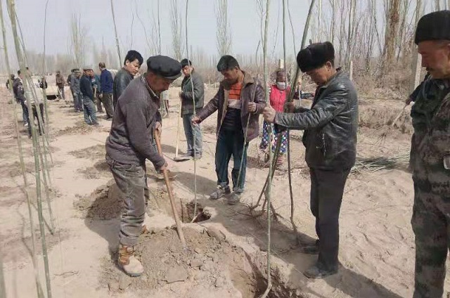 永丰庄村艾合买提·艾克热木说:“在中国共产党的领导下,我们的生活逐渐好起来,我要跟随党的脚步,用自己的力量参与到新和县的绿化建设当中,我感到非常的荣幸,我希望以自己的行动来带动更多的人来参与到建设我们美好家园这项行动中去。”