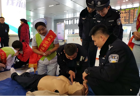 培训活动中,内蒙古人民医院相关科室医务人员通过现场讲解与实操的形式对急救知识进行普及,手把手向旅客宣传讲解急救常识,并以情景再现的形式让旅客与民警参与到了急救活动中。