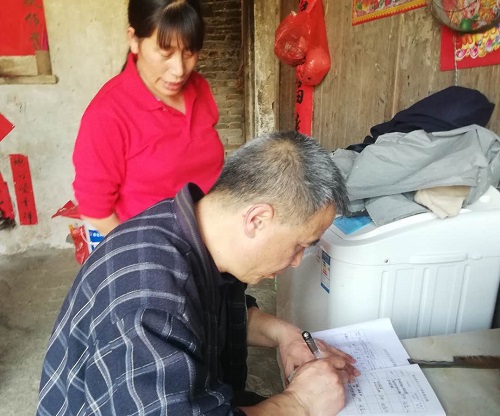 顶着烈日,蒋坊中心小学教师走村入户。每到一组一户,教师与农户拉家常,嘘寒问暖,向农户详细讲解危房改造丶医疗救助、教育扶贫丶就业扶贫等扶贫政策,并细致了解贫困户扶贫措施落实及家庭收支变化等情况。