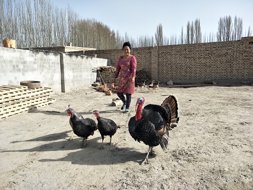 米里且木·托乎提尼亚孜是拜城县大桥乡英买里村1组的村民。去年8月她在工作队的帮助指导下购买了30只火鸡苗进行养殖。火鸡在她的精心饲养下个个长得高壮肉多.还未出栏就几乎被周围食堂抢看预订光了。这不,这几天趁着天好,她就开始修缮家里的棚圈了。
