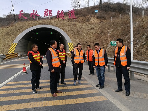 调研组先后经过天水局高养中心管养G30线连霍高速公路宝天段和天水过境段,实地查看了高速公路养护情况,在天水过境段上行线天水郡隧道内对“1cm水性环氧树脂-乳化沥青抗滑表层”路面处治工艺进行了相互交流探讨,并仔细了解了隧道入口过渡护栏和翼墙设置及养护情况。
