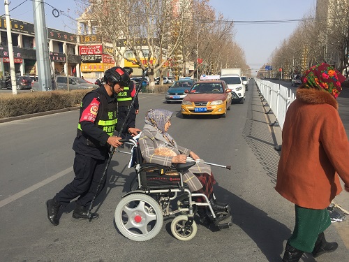 :3月21日,小十字便民警务站执勤人员在日常巡逻时,发现一名坐在轮椅上的老人,在路边徘徊不前,执勤人员见状立即上前询问是否需要帮助:原来此路段车流量较多,老人腿脚不便,现在需要到马路对面去。民警得知情况,立即将老人推至马路对面,并对老人说,您以后有什么需要帮助的,随时告诉我们。老人对巡控队员表示了感谢,并对其热心帮助表示赞扬。