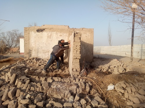 听了老人的陈述,阿瓦提县委统战部驻阿依巴格乡西萨依拉特村第一书记、工作队队长尼加提·阿布拉当即带领队员们到老人家去,在帮助老人推到旧房子的同时,解决庭院杂乱、规划不合理的问题。