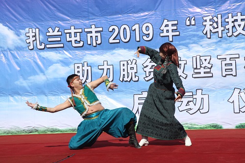 清风网讯(扎兰屯市资讯新闻中心 纪明国 )3月27日,迎着春日的暖阳,内蒙古呼伦贝尔扎兰屯市蘑菇气镇政府广场上歌音嘹亮、彩旗飘扬、人群鼎沸。赶“三下乡”大集的蘑菇气镇19村的农牧民们摩肩接踵,人头攒动。由扎兰屯市委组织部、市委宣传部、市委党校、市农科局、市扶贫办、乌兰牧骑演出队等22单位相关工作人员组成服务团队深入蘑菇气镇开展的扎兰屯市2019年“科技、文化、理论宣讲助力脱贫攻坚百村行”活动在这里正式启动,并在广场上设置服务台,现场发放实物、资料、播放专题片、展览图片、现场示范讲解和乌兰牧骑演出队演出等形式集中进行,阳春三月,为蘑菇气镇农牧民们送上了一道精美的“三下乡”大餐。