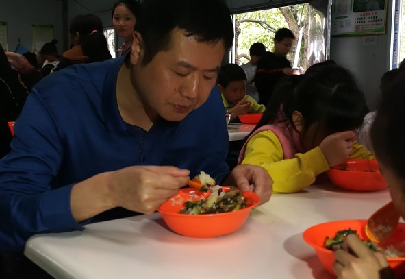鹤城区湖天桥小学是典型的城郊学校,学生80%是进城务工人员子女和农村留守儿童。中午12点,学校校长刘建华准时来到食堂与同学们一起吃午餐。