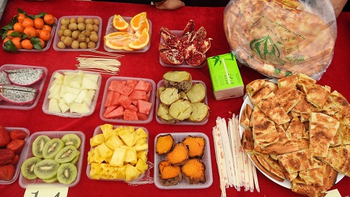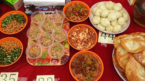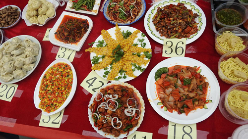 “美食大赛正式开始,请参赛选手和评委们入场!”主持人话音刚落,锦绣美食街的选手们就端上了精心烹制的各具特色的美味佳肴:大盘鸡、红烧羊肉、馕包肉、那仁、丁丁炒面、过油肉面、凉粉、羊杂碎、拌三丝、薄皮包子、薄的透亮的鸡蛋煎饼……纷纷闪亮登场了!不仅有抓饭、馕、烤包子等新疆风味小吃、传统美食,五彩缤纷的水果拼盘、琳琅满目的各色糕点,还有酸奶棕子、玉米薄饼等带着浓厚异域风情的创新美食,道道美食精彩纷呈,不仅外观非常美观,而且色香味俱全,特别是做到了传统美食与现代美食、民族风味大融合的有机结合,着实让现场的300余名各族干部、群众们享受了一番视觉和味觉上的盛宴。