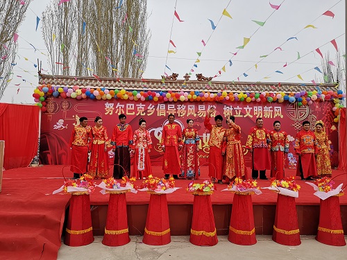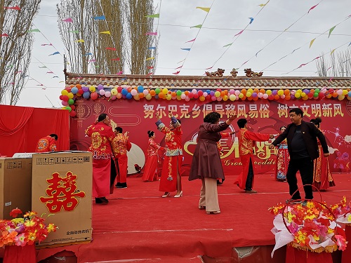 婚礼活动受到县妇联和乡党委的高度重视,县妇联主席和乡党委书记和广大干部出席活动,沙雅电视台记者,录制现场实况,乡长主持证婚,妇联主席走向舞台中央,见证他们交换信物和发表爱情誓言,每人送上一套红色被褥,意为日子过的红红火火,工作队第一书记曹哲代表派出单位为新人们送上了家庭实用的洗衣机,祝福6对新人婚姻幸福美满,爱情地久天长。