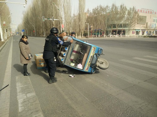 2019年3月29日,名品广场便民警务站车巡组在双拥路巡逻执勤时,一辆满载货物的三轮电动车由于车速过快突然侧翻。民警立即跑过去,将车内人员救出,所幸人员并未受伤。随后合力将三轮电动车扶正,并将散落物品一一搬至车上,提醒他们要遵守交通规则,路上注意安全。