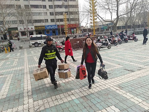 2019年3月29日,小十字便民警务站执勤人员在老步行街巡逻时,发现一名女士提了好几个大箱子,执勤队员二话不说,帮助其将箱子搬至目的地,该女士连声感谢到:谢谢你们为我们群众服务、做好事。