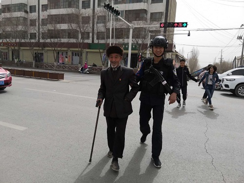 2019年3月29日,老干所便民警务站民警在执勤过程中,发现一名拄着拐杖的老人正步履蹒跚地向马路中央走去,此时过往车辆较多,民警迅速跑至老人身边,拉起老人的手,将老人搀扶到马路对面,老人握着民警的手用不是很流利的汉语说:谢谢你小伙子。民警回答道“不用谢,有需要您找我!”转身又投入到工作中去。
