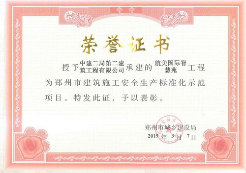 清风网讯(中建二局二公司西北分公司:林涛 陈莹莹)近日,由中建二局二公司西北分公司承建的郑州航美国际智慧苑项目被郑州市城乡建设局评为郑州市建筑施工安全生产标准化示范项目。