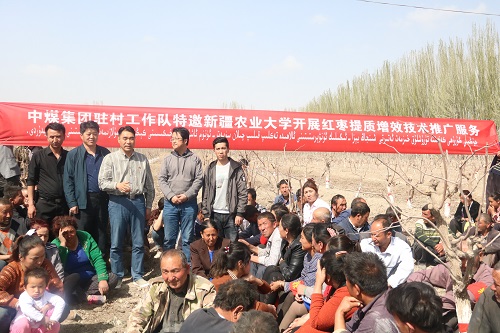 阿瓦提县阿依巴格乡托万克艾来木库都克村有核桃750亩,枣树650亩,由于缺乏林果业技术指导,销售渠道不畅等原因,农民增收效果不明显。针对这些原因,中煤集团驻村工作队4月初邀请新疆农科院教授崔建平和新疆农业大学果树学教授曾斌一行七人到九大队,给村民讲解枣树种植技术,浇水、施肥、除虫、保花等科学管理方法,曾斌讲的很详细,给村民们给出合理的种植建议,枣农们也听的非常认真。