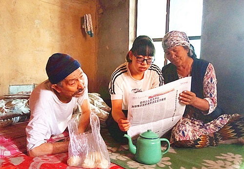 驻村工作队员赵新红与老干部(左一)阿西木·依地尕尔及其老伴同读党报