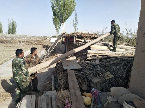 4月10日,新疆沙雅县努尔巴克乡良种场四老人员任信江的家中,一群年轻人正在搬木头,打扫卫生。工作队队员阿不拉·萨吾提特意嘱咐老人说:“叔叔,您有什么问难一定要及时给我们工作队打电话,我们会想把您的困难当成自己家人的困难来对待。”