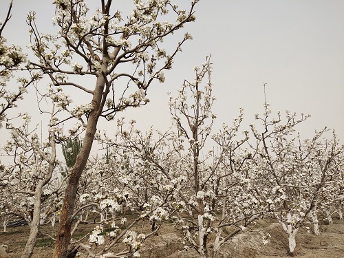 “忽如一夜春风来,千树万树梨花开。”春风荡漾,梨树花开,努尔巴克乡良种场的千树梨花,迎来了最佳观赏期。梨花似雪香满径,千朵万朵压枝低。雪白的梨花连城一片,胜似花的海洋,走进一看,一朵梨花,气味芬芳,令人陶醉。
