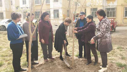 清风网讯( 拜城镇英巴扎社区工作队: 付晓琳)春暖花开,又到了植树的好季节。2019年4月10日,拜城镇英巴扎社区工作队组织五名队员与自己的结亲户开展了一起植树活动。你看这边,在华庭小区院内的绿化带中扎依那甫古丽·依斯兰与自己的亲戚一人扶一人埋,乔新阳与自己的亲戚一人栽种一人浇水;还有那边,瑞康美居院内的绿化带中其他的队员也正与各自的亲戚在忙活着......,大家都忙得热火朝天。