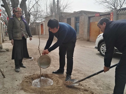 村民如孜汗·阿布拉:“我的亲戚从县里拿来的树苗,我跟我的亲戚一起种,我们会好好守护,让它茁壮成长,种下团结树让我和我亲戚的感情也会越来越好。”