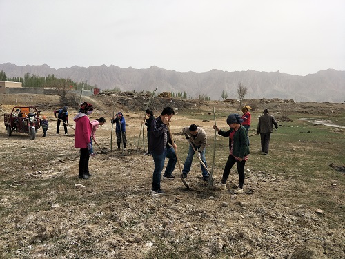 在喀日尕依买里村的宽阔场地、闲散边角等植树造林现场,处处呈现出一派繁忙有序、热火朝天的劳作景象。“访惠聚”工作队和群众默契配合,整垄挖坑、扶正树苗、培实新土、踏土压实,不一会功夫,一棵棵树苗挺拔的“站在”泥土里,裸露的土地逐渐地“染上”了一抹绿色。
