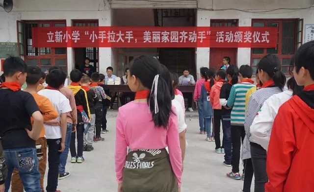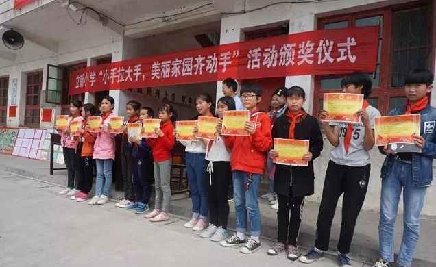 3月26日,该小学少先队组织了一次社会实践活动,学生们一队队拿着扫帚、垃圾桶、撮箕、夹子,到通往各村的道路进行义务劳动,悬挂横幅,路上看到熟识的大人乱扔垃圾,孩子们上前真诚地劝导。