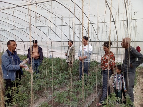 在贫困村民买买提•艾买提的大棚内,张忠远手把手指导贫困村民如何对西红柿进行整枝打叉,如何进一步加强大棚蔬菜的管理。贫困村民们说,原来都不知道西红柿还要打叉,还以为那些叉枝也会接西红柿,今天总算知道了西红柿整枝打叉的重要性。