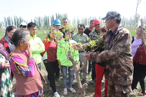 清风网讯(沙雅县教育局驻村工作队:畅玉萍 )2019年4月23日,沙雅县教科局驻红旗镇喀什托格拉克村工作队邀请阿克苏红枣种植大户郭志强来村进行红枣修剪技术培训。全村50余名果树种植户进行了现场观摩和学习,并就自家红枣种植中存在的疑难和困惑进行了咨询,郭老板一一进行现场解答。