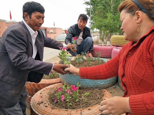 年初,工作队提前谋划,积极协调250余条废旧轮胎,发放给每家每户,花费2200余元购买油漆对轮胎进行喷绘,统一从阿克苏购买万寿菊、矮牵牛等花卉,发放给村民。