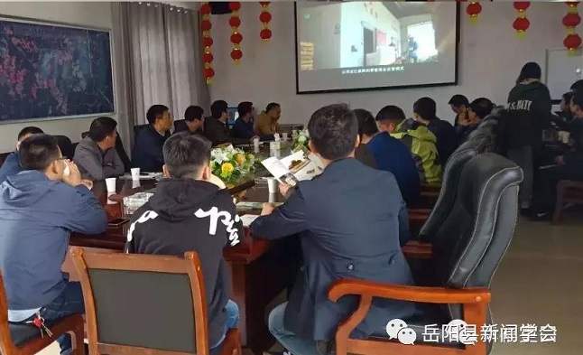 在岳阳峰岭菁华果业股份有限公司会议室,董事长李重立热情接待了客人们,来宾们一边观看视频一边听取李董介绍公司发展史。该公司落户于岳阳县筻口镇大塘村,2011年开工建设,2014年4月成立股份有限公司,在征地、发展产业扩大生产规模等方面得到了筻口镇党委、政府的大力支持。