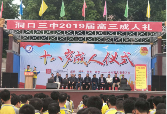 清风网邵阳讯(通讯员:童芤 刘桂阳) 肩负责任担当,筑就青春梦想。为了进一步增强青少年成年后的社会责任感,引导高三同学在成人之际学会感恩与宽容、积极承担社会责任、遵纪守法、做一个合格的公民,5月4日下午,正值五四运动100周年之际,洞口县第三中学在田径场隆重举行首届以“成长、感恩、尽责、明智”为主题的十八岁成人礼,学校领导、高三年级全体老师、学生家长代表共同见证了这一激动人心的时刻。