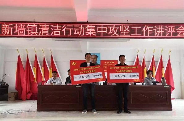 会议就新墙镇第一季度村庄清洁行动工作通过PPT形式,从挂图作战、各村共性问题、各村突出问题以及攻坚成果展示作了讲评,并对“四拆除”进度与3、4月份多次督查汇总进行通报,现场分示范村与达标村两类兑现了考评奖奖励,先进单位三合村和双枫村作了示范典型发言。