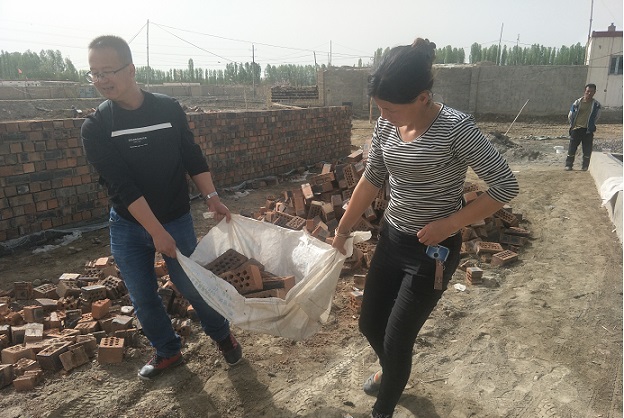 一行人经过商量,决定帮助依干拜迪·艾海提把院墙修建起来,并对他家院子进行合理规划,对房屋大门前后的地面用水泥进行硬化、美化,将院子后面的一些空地上的石头、砖块进行清理,将它恢复成耕地让依干拜迪·艾海提发展庭院经济。依干拜迪·艾海提听到大家对他家院子进行修整的意图后连连说“规划的好,设计的好。