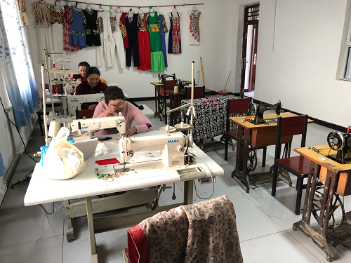 刺绣缝纫合作社开办初衷就是想让村里的贫困家庭妇女多一条增收渠道,帮助贫困家庭脱贫。现在,村里的20多名妇女一有空就到这里来学习裁剪技术,制作服装、床上用品、台布、座垫等,目前已经小批量生产,通过自产自销的方式销售给本村的村民。