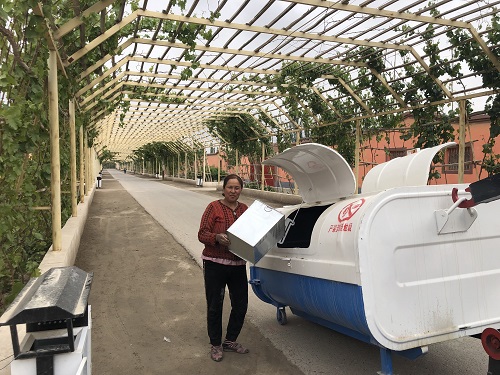 清风网讯(沙雅县草原站驻努尔巴克乡和谐村工作队:田麒麟)5月11日清晨9点,村民古丽尼沙汗·艾则孜早早的在家门口等待垃圾收集车的出现,准备将门口的垃圾处理掉。