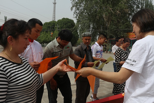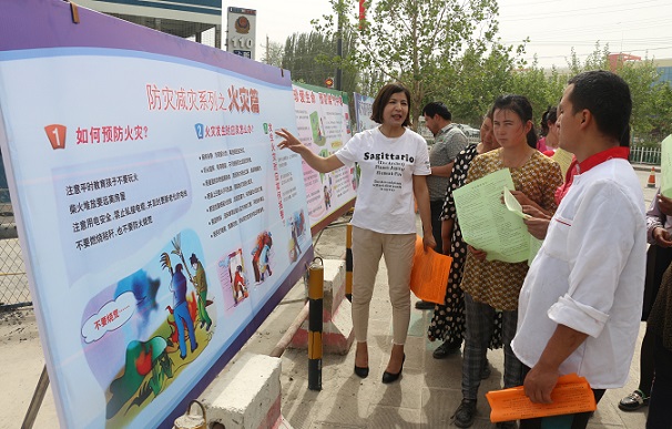 “今年5月12日是第十一个全国防灾减灾日。当我们遇到地震、火灾、煤气中毒等灾难时,大家不要紧张,要保持冷静,我们可以自救也可以帮助别人,所以这个宣传册,一定要看一看,回去多了解了解……”乡宣传办努尔古丽.艾海提向来往的乡民宣传着防灾减灾小知识。