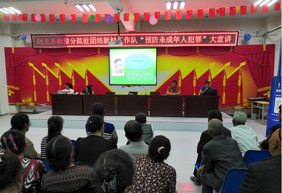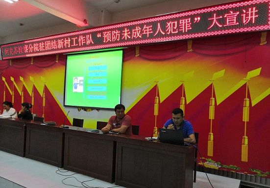 清风网讯(阿克苏检察分院:屈亚博)为进一步提高团结新村未成年人法律意识和保护自身合法权益的能力,切实营造全社会关心爱护未成年人的社会环境,5月12日晚,阿克苏检察分院驻阿瓦提县阿依巴格乡团结新村“访惠聚”工作队举办预防未成年人犯罪宣讲活动。